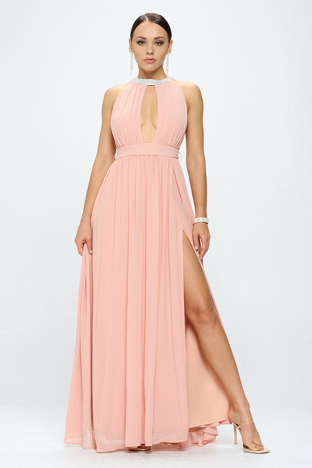 RHINESTONED HALTER NECK BELTED SLIT MAXI DRESS