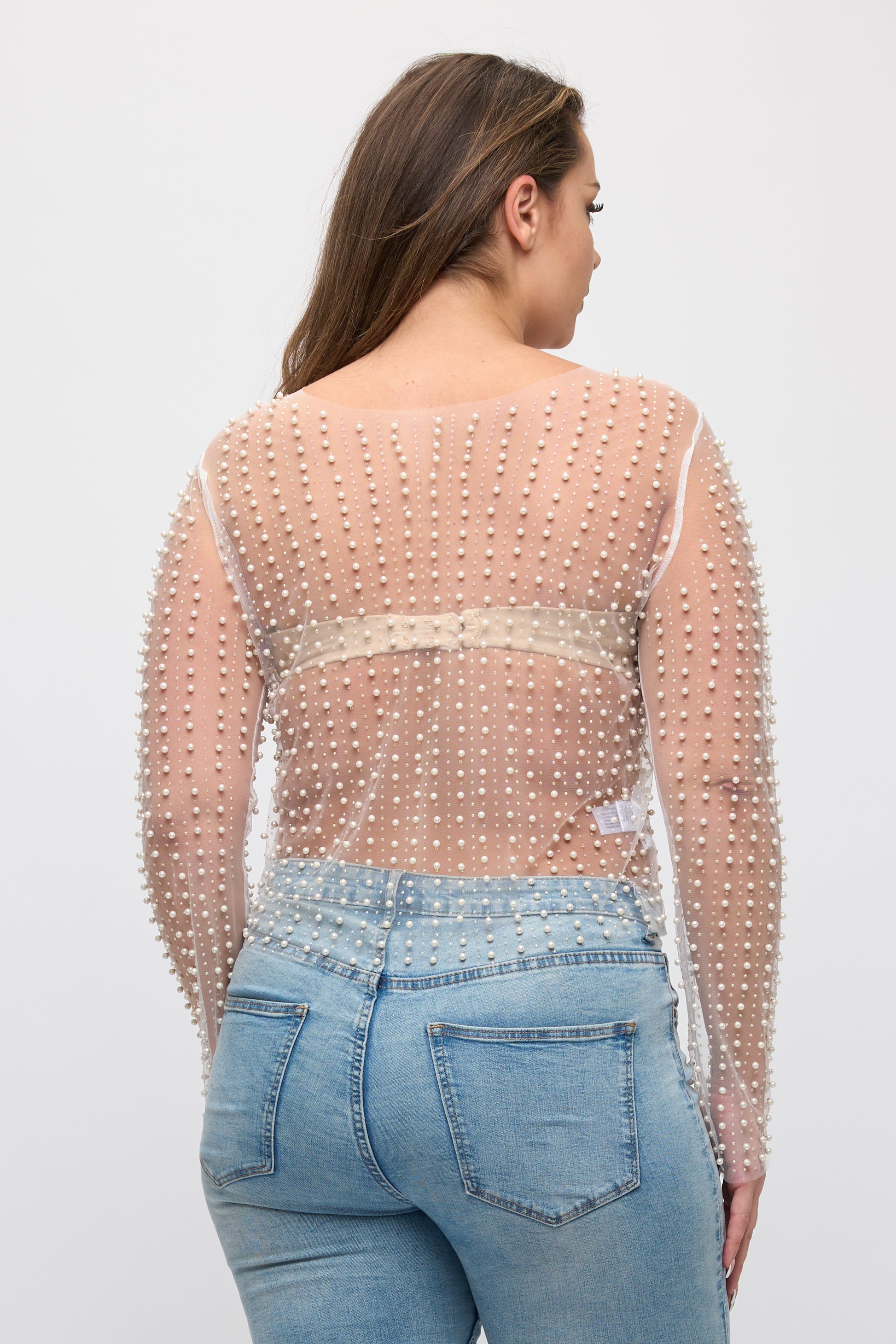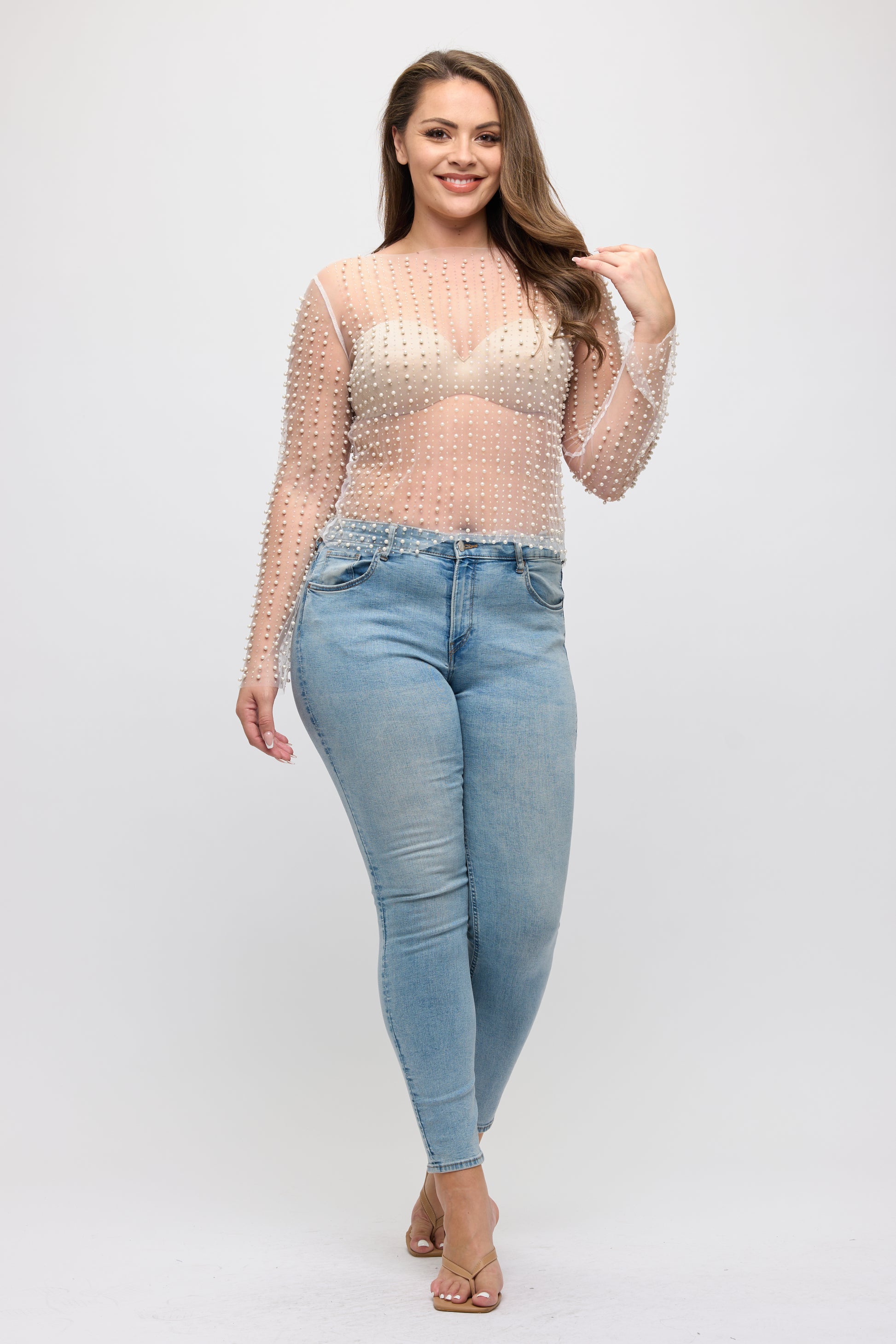 RHINESTONES PEARL SHEER MESH LONG SLEEVE TOP-PLUS