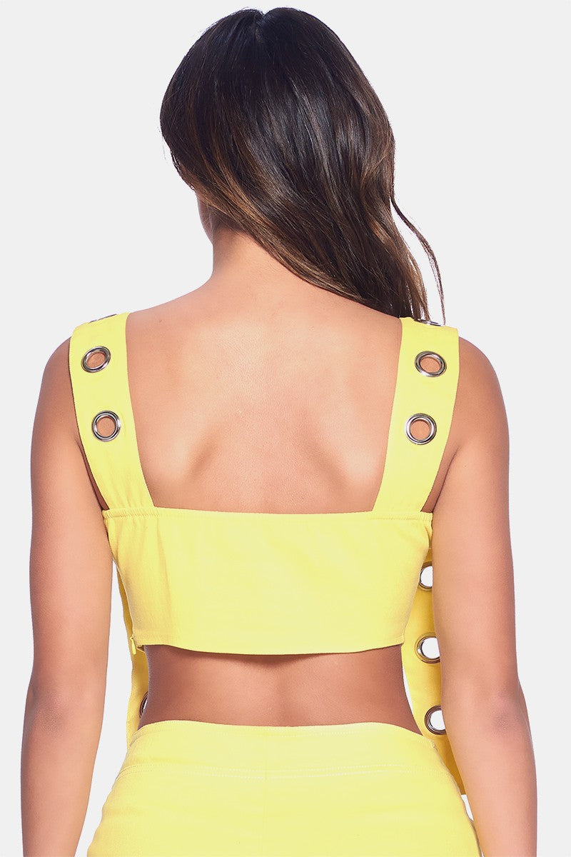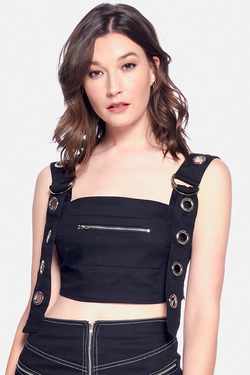RING HOLES DETAIL CHEST ZIPPER OPEN BACK CROP TOP