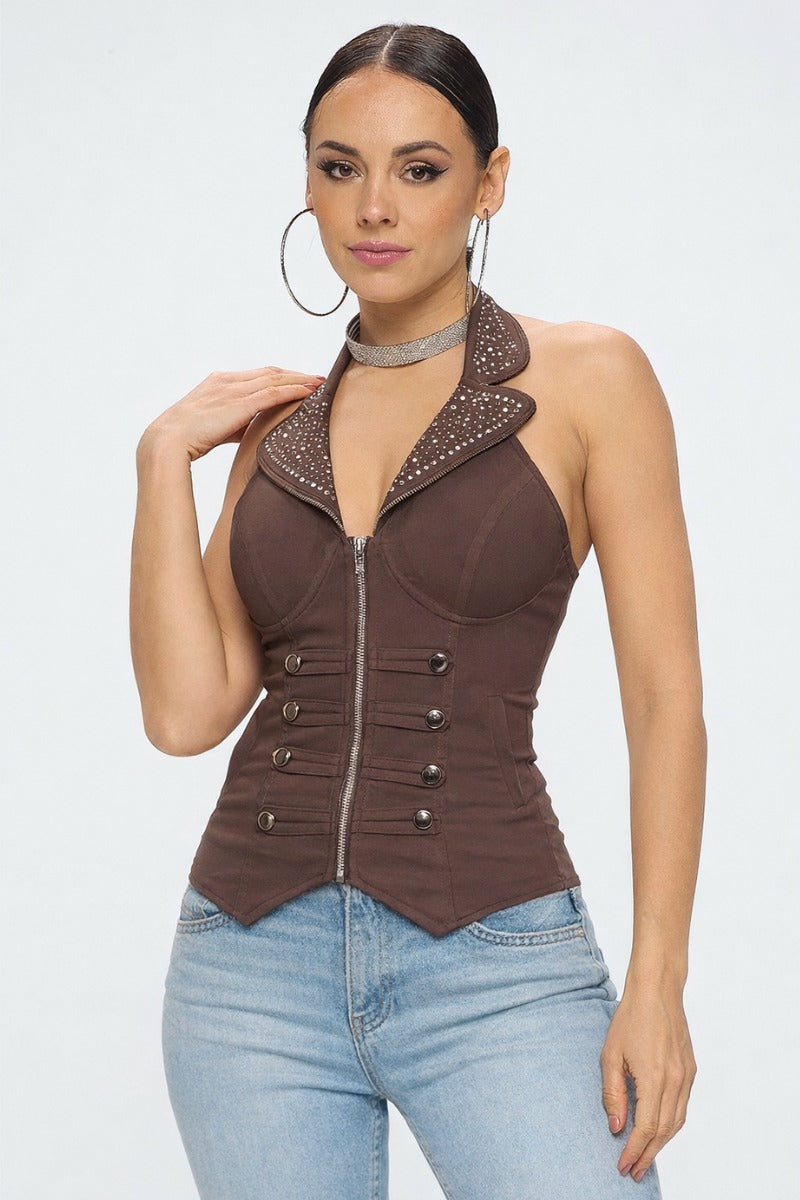 SAILOR COLLAR BEADED ZIP UP FRONT TANK TOP_D6752