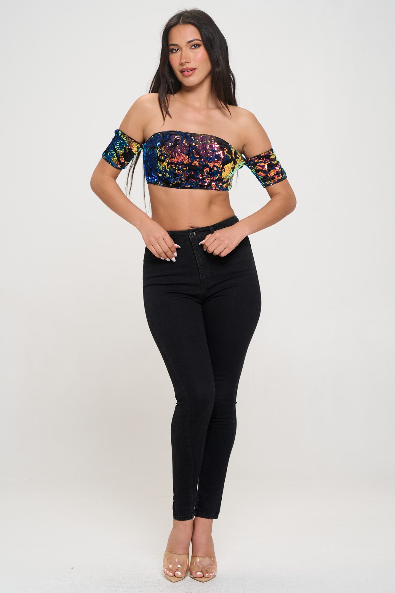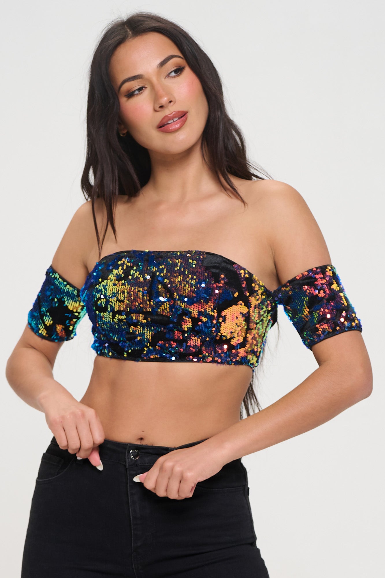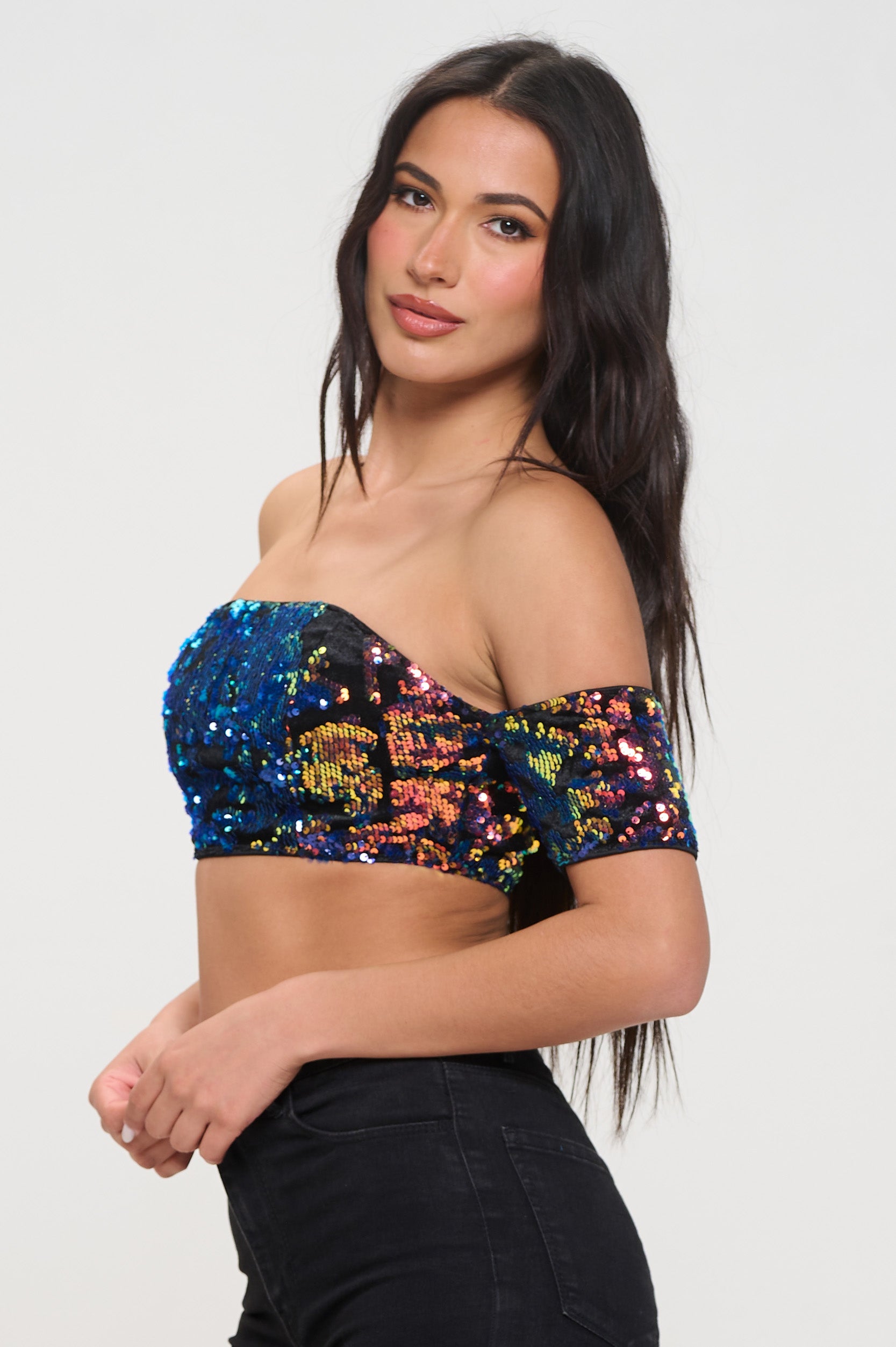 SEQUIN VELVET COLD SHOULDER BANDEAU CROP TOP