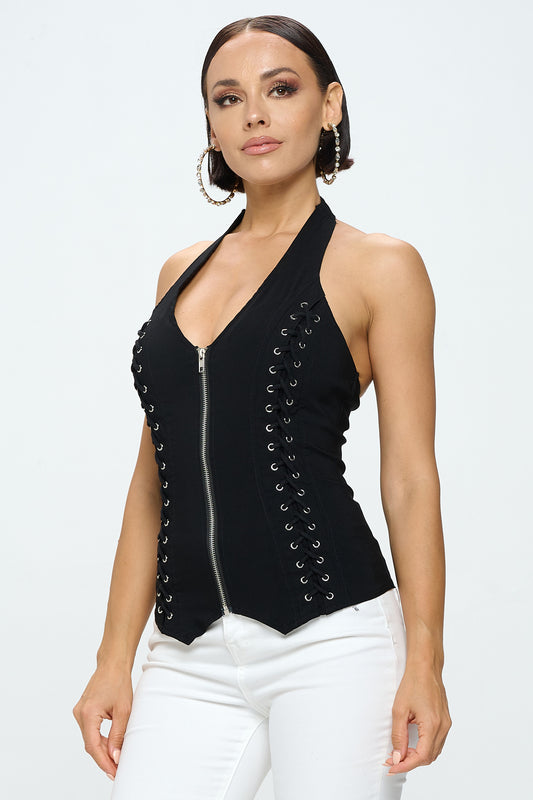 LACE UP DETAIL ZIP FRONT SLEEVELESS HALTER NECK TANK TOP_D6838